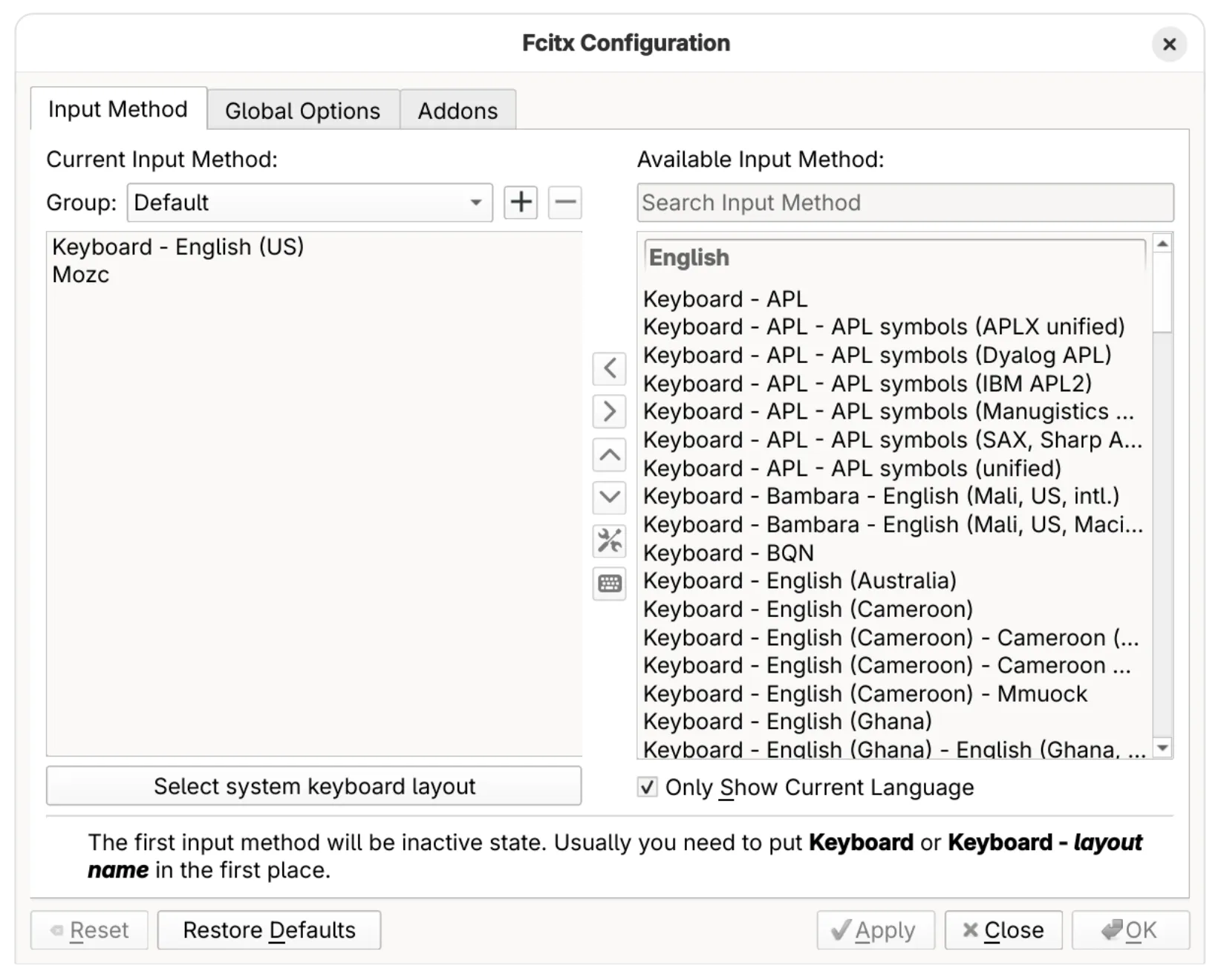 起動できたら、Fcitxの設定でUSとMozcを有効にしておきます。