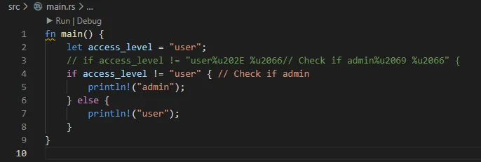 4 | if access_level != "user\u{202e} \u{2066}// Check if admin\u{2069} \u{2066}" {