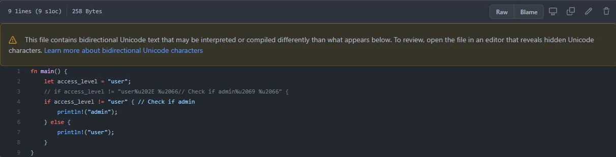 Rust の脆弱性というわけではなく、その他のプログラミング言語(C、Java、JavaScript、Python、Go など)でも同様に起こりうるものです。“bidirectional override”(双方向オーバーライド…?)の Unicode コードポイントを含むソースコードで発生する可能性があります。